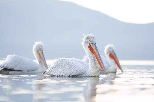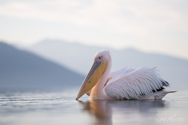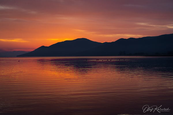 Die Hauptattraktion sind die Krauskopfpelikane, Rosapelikane und Flamingos, die sich elegant im Wasser bewegen. Insbesondere die Pelikane bieten in der winterlichen Umgebung ein faszinierendes Schauspiel. Ihre imposante Gestalt und Größe, das Federkleid bei den Krauskopfpelikanen und der charakteristische Schnabel, haben uns sofort begeistert. Im Januar sind viele der Pelikane im Prachtkleid und in dieser Zeit ist der Kehlsack intensiv rot gefärbt. Wie sie über das Wasser gleiten, die Action der Start und Lademanöver und der Beutefang sind besonders spannende und lohnende Momente. Insbesondere im sanften Morgenlicht oder dem Gegenlicht der untergehenden Sonne. Das winterlichte Bergpanorama bietet dabei besondere Perspektiven.