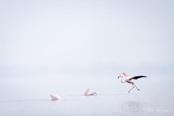 Auch die Flamingos, mit ihrer zarten Rosafärbung und ihrer anmutigen Haltung, sind ein wahrer Blickfang. Sie kontrastieren wunderbar mit dem gedämpften Hintergrund des Winters am Kerkini See und schaffen einzigartige Kompositionsmöglichkeiten. Ihre Spiegelbilder im stillen Wasser, unterbrochen von gelegentlichen Wellenbewegungen, schaffen Bilder von fast surrealer Schönheit. Wenn dann noch der Nebel aufkommt, verschwindet jeder Hintergrund in der Unendlichkeit.