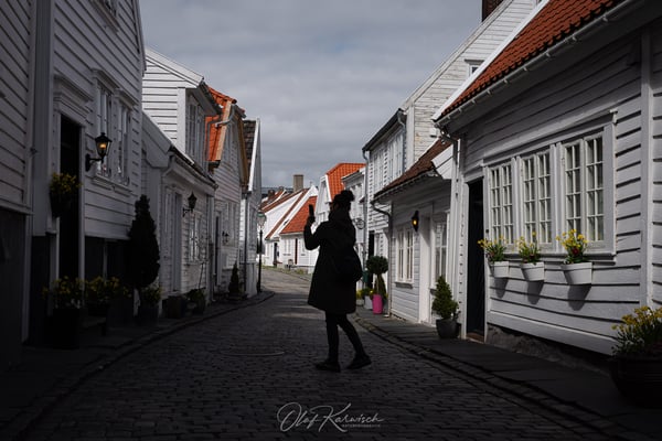 Wir besuchen zuerst die charmanten, weiß gestrichenen Holzhäuser in Gamle Stavanger, die eine Fülle an Motiven und einen schönen Blick in die vergangenen Zeiten bieten. Die Bewohner geben sich große Mühe, das Viertel auch heute noch attraktiv zu erhalten.