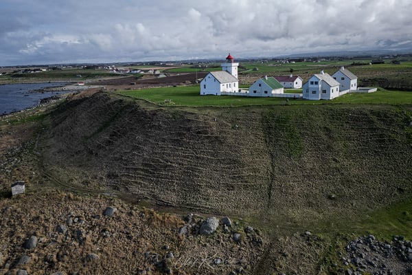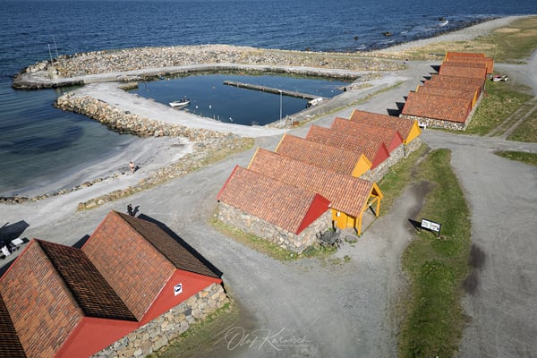 Immer wieder weisen uns braune Schilder auf kulturelle und historische Sehenswürdigkeiten hin. Die eine oder andere steuern wir auch an. Helleren ist einer dieser beeindruckenden historischen Orte im Magma Geopark, an dem zwei kleine, gut erhaltene Häuser unter einem riesigen Felsvorsprung stehen. Die natürliche Überdachung durch den Felsen hat die Gebäude über Jahrhunderte hinweg vor Wind und Wetter geschützt, und sie sind ein Zeugnis für die einfache, aber clevere Bauweise der damaligen Zeit.