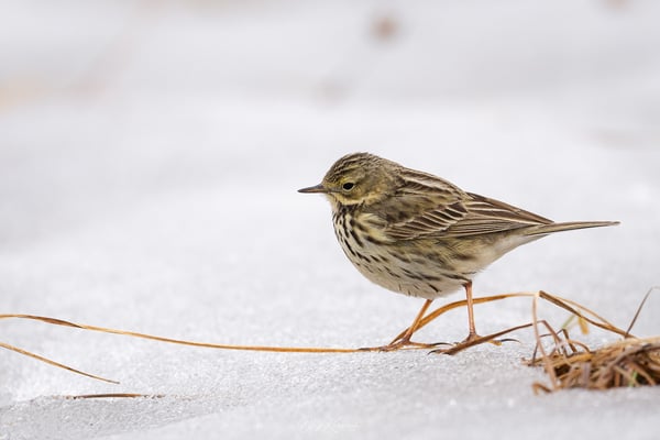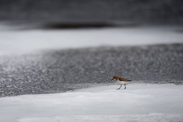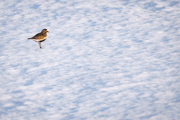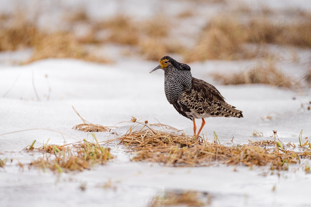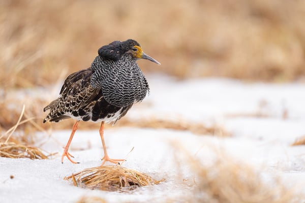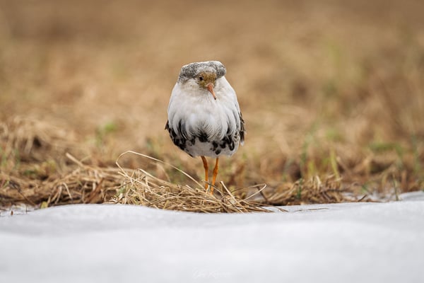 Kurz vor dem Ziel biegen wir links von der Straße ab. Es geht über einen holprigen Schotterweg, der mit Schlaglöchern übersät ist, sechs Kilometer hinauf auf eine etwas höher gelegene Ebene. Während an der Küste kaum noch Schnee zu sehen ist, sind hier oben die kleinen Seen noch fast zugefroren, und einzelne Schneefelder säumen die Piste. Kurzum: Wir sind wieder einmal in einer wunderschönen, leicht winterlichen Landschaft angekommen – verbunden mit der seltenen Möglichkeit, Kampfläufer im Schnee und auf dem Eis zu fotografieren.
