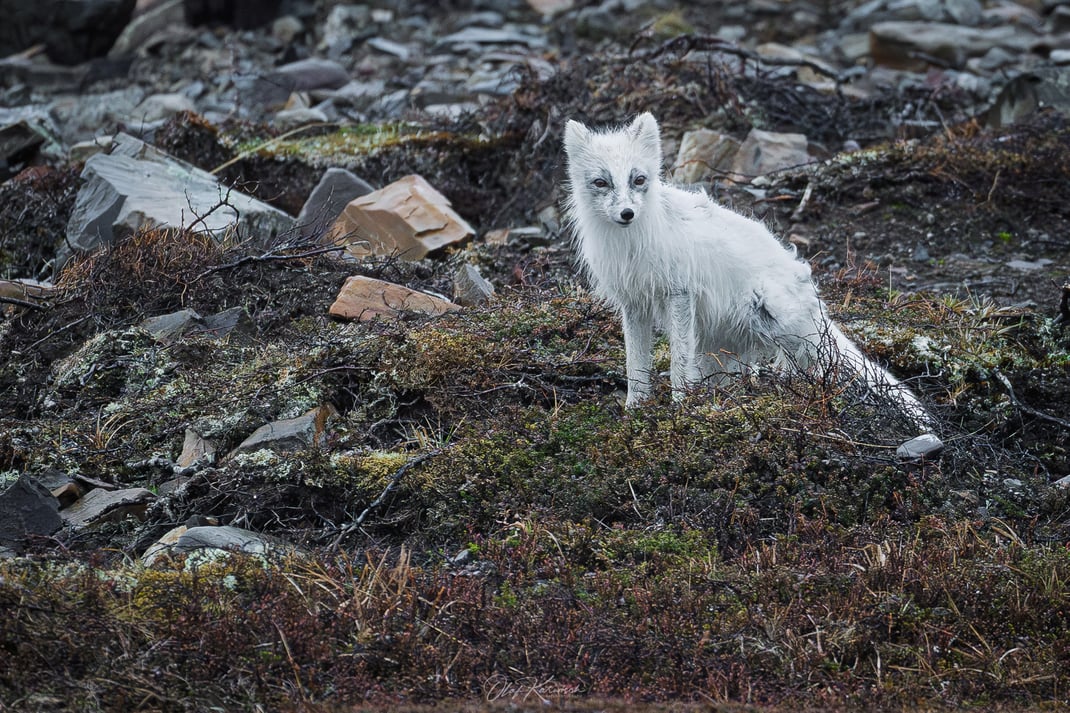 An einem anderen Tag entschieden wir uns, einen Abstecher nach Vardø zu machen. Zum einen wollten wir die Batterien aufladen, Vorräte auffüllen und Frischwasser tanken. Erst am späten Abend – es war schon gegen 21:30 Uhr – machten wir uns bei aufkommendem Regen auf den Rückweg. Und dann plötzlich: Die ersten beiden Autos standen am Straßenrand, die Insassen standen neben den Autos mit Blick auf einen Berghang in der Nähe des Flugplatzes. Als wir näherkamen, sahen wir ihn – den Polarfuchs! Er läuft gerade den Hang hinauf und hat vermutlich kurz zuvor die Straße überquert, wodurch er aufgefallen war.