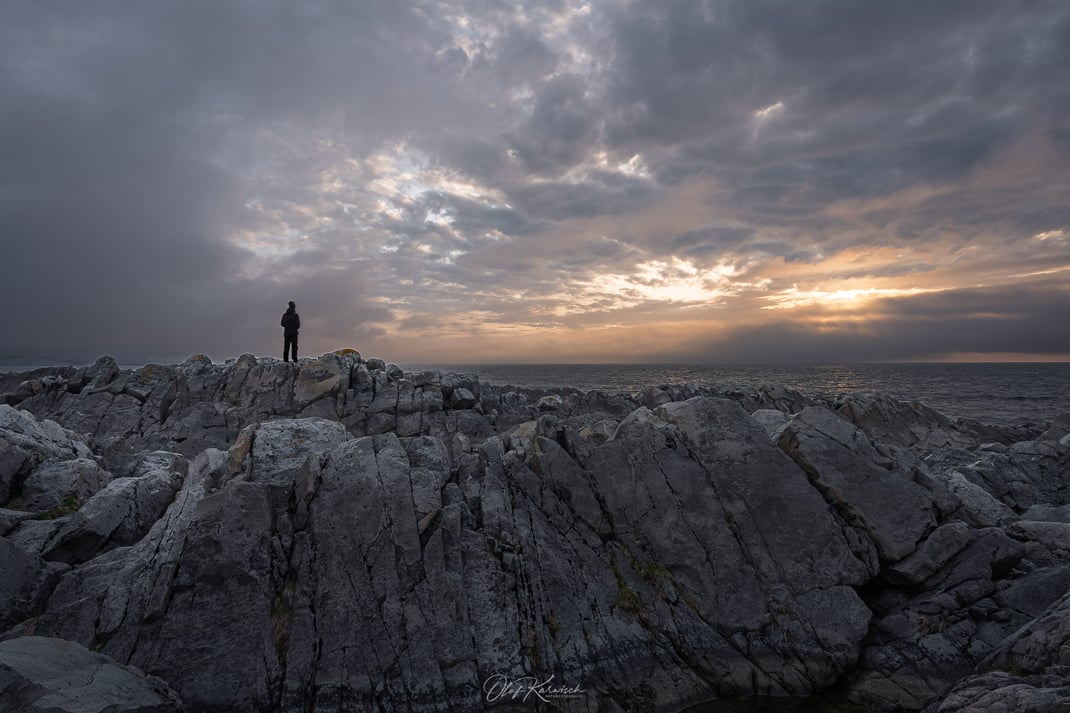 Auf der anderen Seite von Hamningberg befindet sich ein großer Parkplatz mit geschotterten Stellflächen für Camper. Wer es lieber etwas wilder mag, kann dem Weg noch ein Stück weiter folgen und erreicht einen Strandabschnitt, der ebenfalls Stellfläche bietet. Als wir am späten Abend gegen 22 Uhr ankommen, stehen schon einige Camper verteilt entlang der Küste. Wir finden schnell einen Platz, machen noch einen kleinen Spaziergang entlang der steinigen Küste und werden belohnt: mit einem fantastischen Sonnenuntergang und der Sichtung eines Seeadlers, der die Küste absucht.
