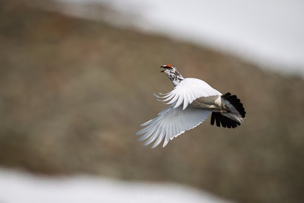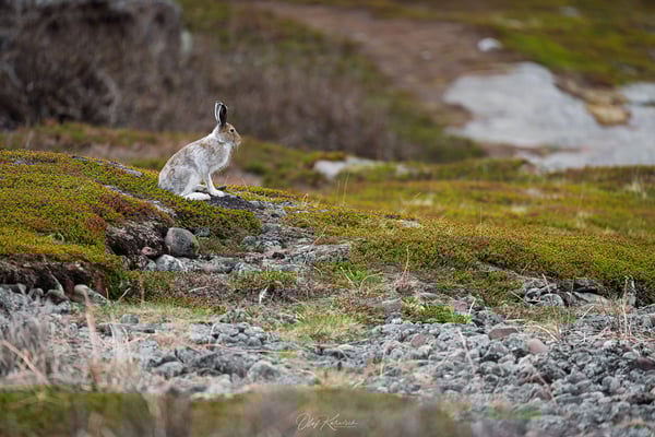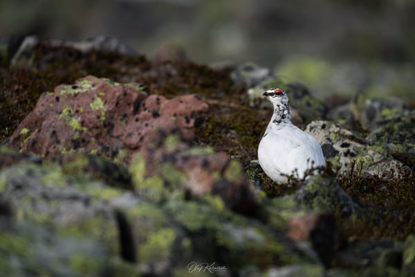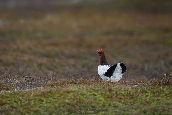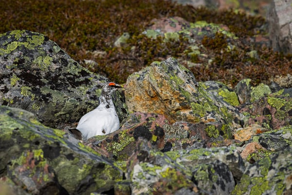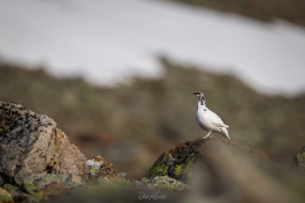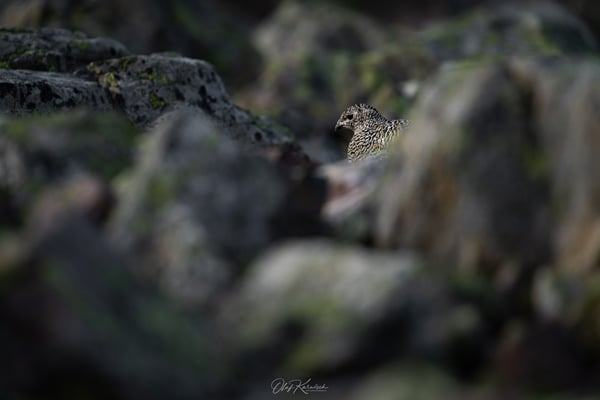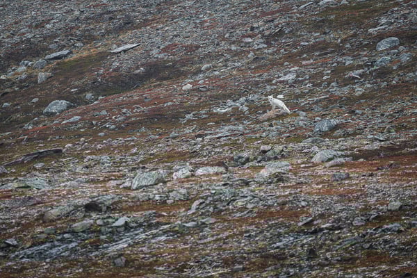 Wir selbst erleben ein anderes, nicht minder schöne Begegnung: In der steinigen Hügellandschaft kreuzen plötzlich zwei Schneehühner unseren Weg. Das Männchen fliegt zunächst auf, um die Lage zu sondieren, kehrt aber nach kurzer Zeit zurück. Dann haben wir die Gelegenheit, das Paar längere Zeit zu beobachten. Zu unserer Überraschung sind sie recht entspannt, laufen um uns herum, als wir uns auf die Steine setzen. Ein unerwarteter Moment der Nähe.