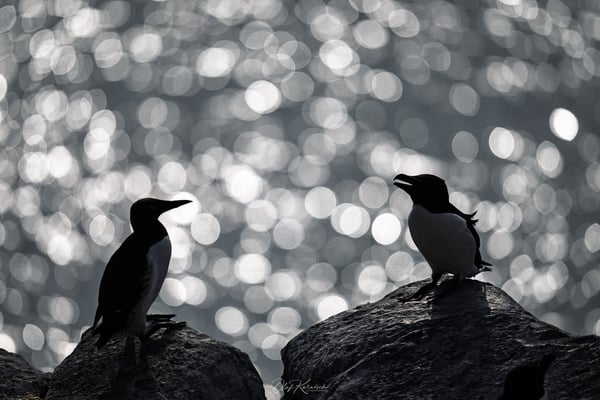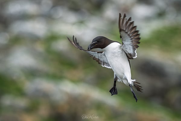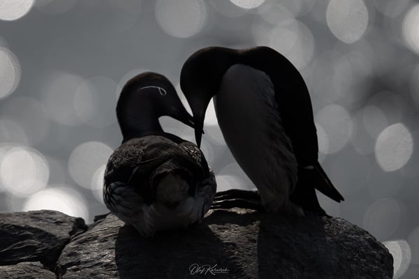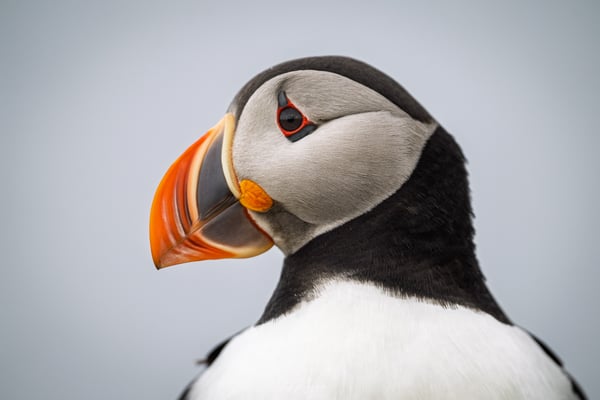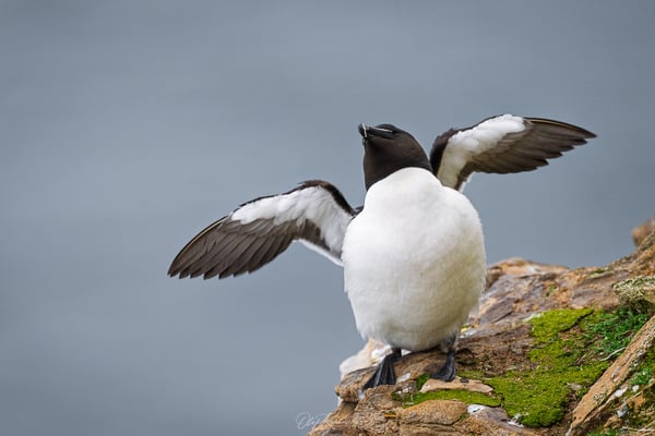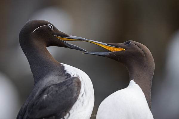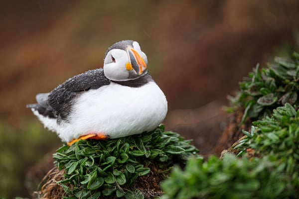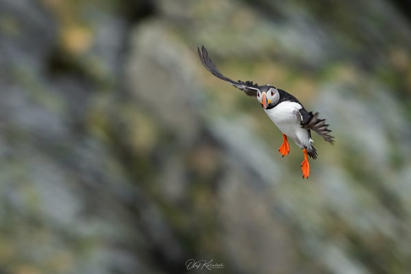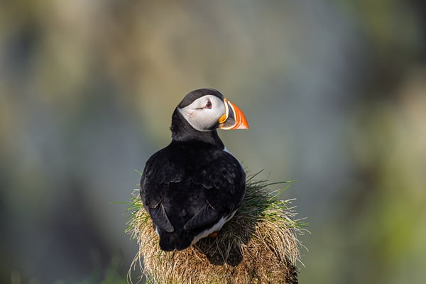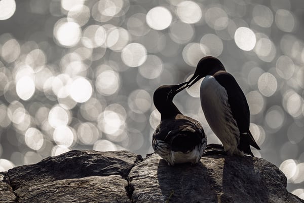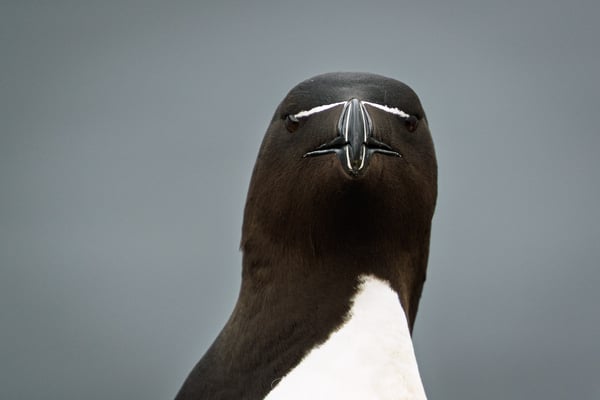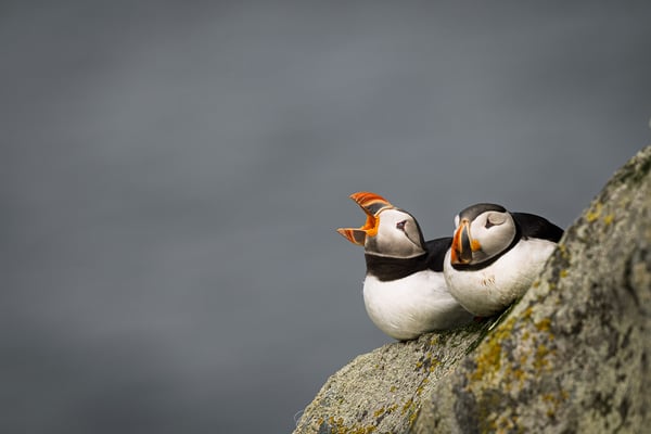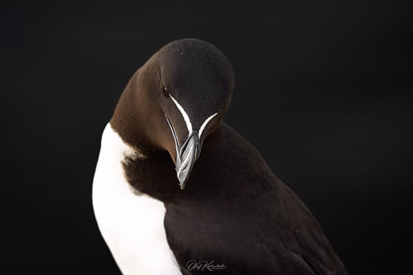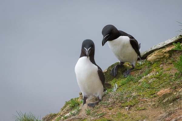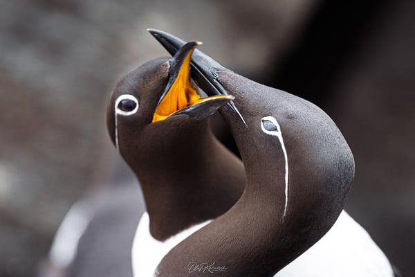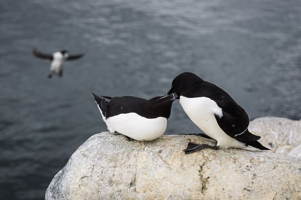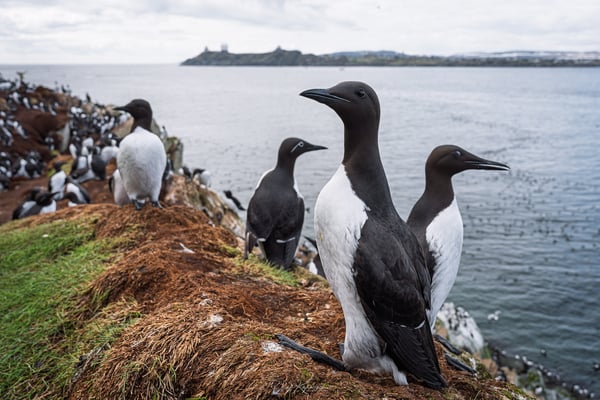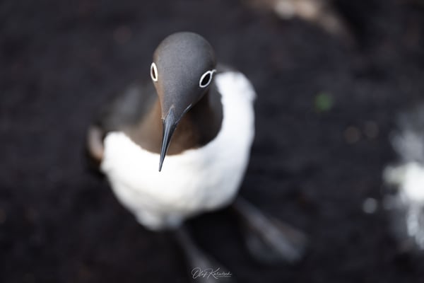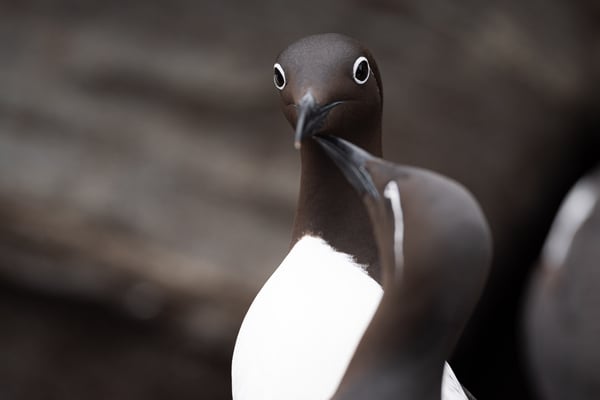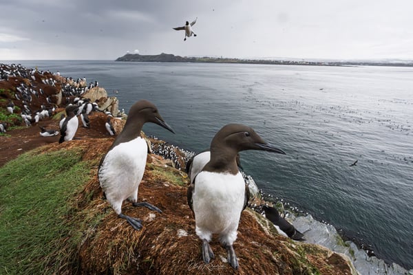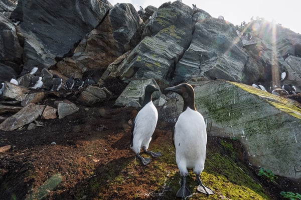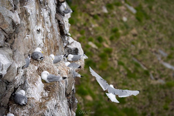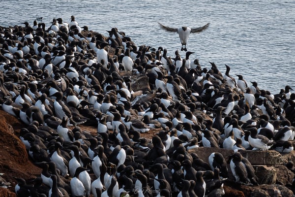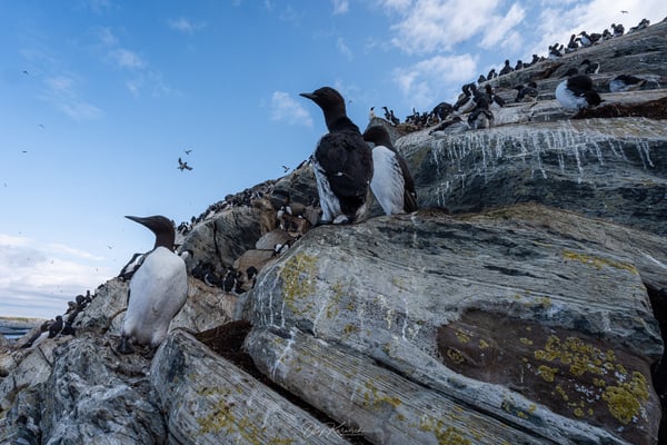 Als wir den Blick zur steilen Felswand vor uns heben, geht das Spektakel nahtlos weiter: Dreizehenmöwen, Krähenscharben, Trottellummen und Tordalke brüten oder bereiten sich auf die Brut vor. Sogar die ersten Papageitaucher-Nester fallen uns auf – sie liegen direkt auf Augenhöhe oder nahe am Boden. Im ersten Moment sind wir völlig überwältigt von der schieren Masse an Vögeln. Wo sollen wir hier jemals ein Fotomotiv finden?
