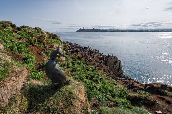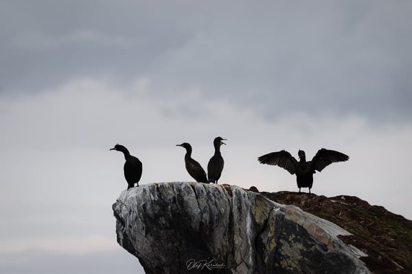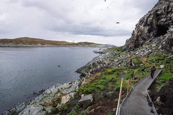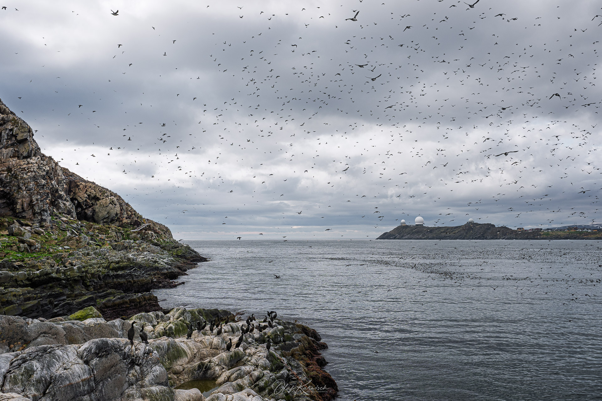 Schon während der Überfahrt sind wir überwältigt. Tausende von Vögeln steigen aus dem Wasser und den Steilwänden auf. Zwei Seeadler gleiten dicht an der Küste entlang und sorgen für ordentlich Tumult. Überall kreischen, flattern und jagen Vögel durcheinander. Wir wissen gar nicht, wo wir zuerst hinschauen sollen. Auf den Bildern lassen sich diese gewaltigen Vogelschwärme kaum erahnen – daher nehmen wir nur ein einziges Foto dieser Szene in unsere Auswahl.