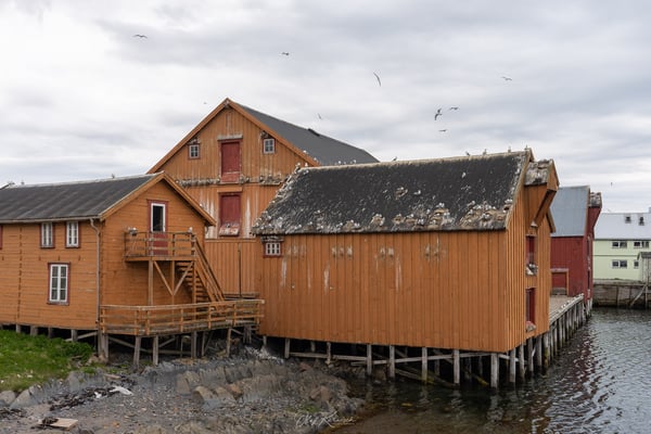 Nach einigen Kilometern taucht eine kleine Siedlung auf. Die Häuser schmiegen sich an die Felsen, als suchten sie Schutz vor Wind und Wetter. Und dann, nach rund 35 Kilometern, liegt plötzlich Hamningberg vor uns: ein winziges, verlassen wirkendes Fischerdorf mit alten Holzhäusern und Bootshütten, die sich entlang der Küste ziehen. Früher ein belebter Ort, heute eher ein Freiluftmuseum – und doch mit einer ganz eigenen, stillen Magie.