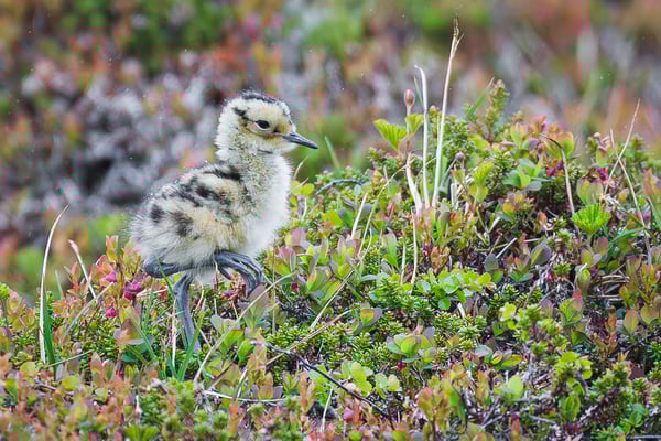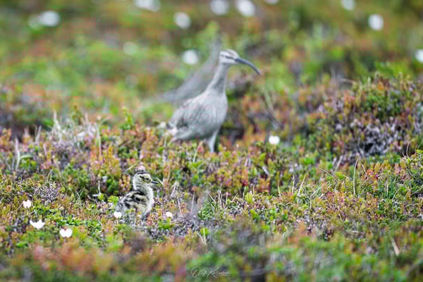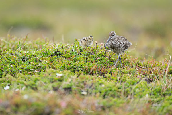 Nach einiger Zeit entdecken wir schließlich Regenbrachvögel. Eigentlich machten sie selbst auf sich aufmerksam – recht energisch sogar, vermutlich weil wir uns in der Nähe ihres Brutgebiets bewegten. Plötzlich huschte ein kleines Federknäuel über den Weg und verschwand blitzschnell im dichten Grün. Es war wirklich wie vom Erdboden verschluckt. Erst als es an einer anderen Stelle wieder aus dem niedrigen Bewuchs auftauchte, konnten wir erkennen: Es war das Jungtier des Regenbrachvogels.