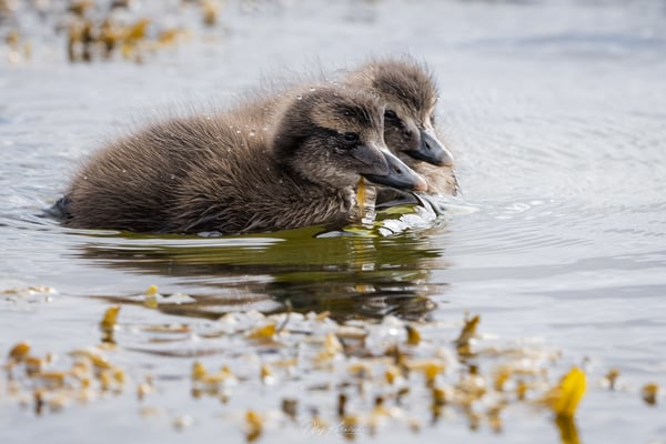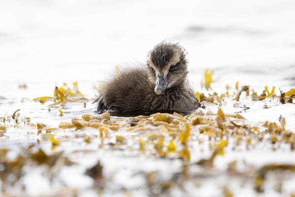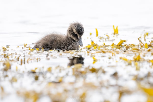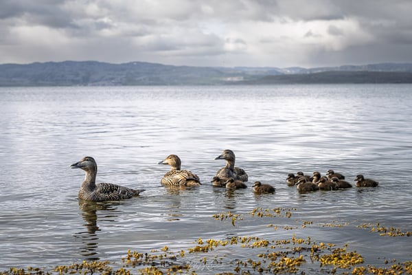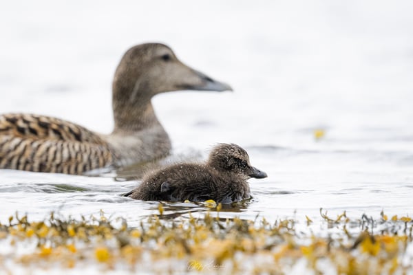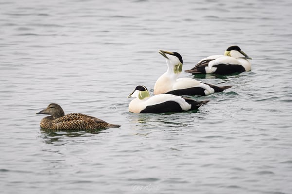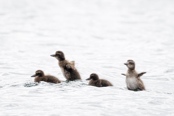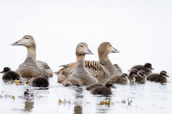 An den zwei Tagen vor Ort beobachten wir auch eine Gruppe von Eiderenten mit ihren Jungtieren. Hier läuft das Ganze offenbar etwas anders: Es ist kaum zu erkennen, welche Küken zu welcher Mutter gehören – denn rund zehn Jungtiere werden gemeinsam im Verbund begleitet und bewacht. Ständig sind mindestens drei Weibchen in ihrer Nähe, oft gesellen sich noch weitere Weibchen und gelegentlich auch ein oder zwei Männchen dazu.