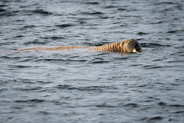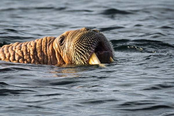 Wir haben an diesem Tag allerdings ein ganz anderes, unerwartetes Highlight. Kurz vor Vardø laufen wir den Deich entlang, als plötzlich ein lautes Ausschnaufen an der Wasseroberfläche zu hören ist. Wir drehen uns um – und trauen unseren Augen kaum: Nur wenige Meter neben dem Deich taucht ein Walross auf! Riesig, mit mächtigen Stoßzähnen und glänzendem Fell liegt es im Wasser, holt tief Luft und gleitet wieder in die Tiefe. Etwa fünf Minuten später taucht es erneut auf, atmet langsam, um dann wieder abzutauchen. Diesen Rhythmus können wir noch einige Male beobachten, während sich das Walross langsam weiter von uns entfernt.