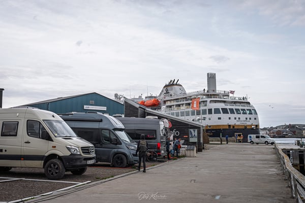 Mit unserem Van fahren wir direkt zum Hafen und finden an der Touristeninfo neben den Anlegern einen geeigneten Stellplatz. Es gibt Strom – wenn auch teilweise nur mit einem sehr langen Kabel erreichbar. Wir haben Glück und bekommen einen Platz in der Nähe der Steckdosen. Eine Dusche und Toilette finden wir entweder in der Touristeninfo oder im Hotel auf der anderen Straßenseite. Im Hotel kann man übrigens auch den Platz bezahlen, falls die Info geschlossen ist.