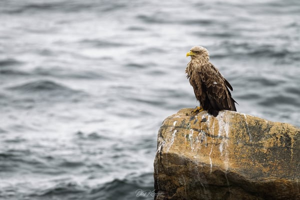 Eine weitere Möglichkeit, Seeadler zu beobachten, bietet sich auf der Autofahrt von Ekkerøy in Richtung Osten schon auf den ersten Kilomentern. Hier hatten wir bei vier Fahrten eine beeindruckende 100%-Quote – meist mit mehreren erwachsenen Vögeln. Besonders ein Exemplar zeigte sich relativ unerschrocken und blieb zweimal „nahe“ der Straße auf einem Felsen sitzen. Glücklicherweise konnten wir dort kurz anhalten und ein paar Bilder machen.