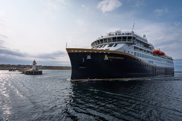 Am Kai beobachten wir eine Seeschwalbe, wie sie immer wieder ihr Junges füttert. Leider wird das Schauspiel von vorbeilaufenden Fischern gestört – und auch wir lassen uns kurz ablenken: Ein Schiff der Havila Kystruten kündigt sich mit einem lauten Horn an. Faszinierend, wie das große Schiff durch die enge Kaiöffnung manövriert und im Hafenbecken einmal um die eigene Achse dreht.