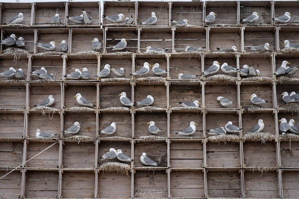Über eine Brücke erreichen wir die andere Hafenseite. Wir laufen bis zum Kai, vorbei an ausgemusterten Booten und einem Stapel Boxen, die offenbar als Nistplätze für Möwen dienen. Ob die Boxen den Vögeln zusätzliche Brutplätze bieten sollen oder die Häuser vor ihnen schützen – das werden wir wohl nicht erfahren. Ein spannendes Fotomotiv sind sie auf jeden Fall.