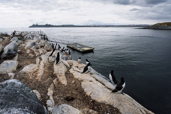 Über einen kleinen Metallsteg betreten wir schließlich die Vogelinsel Hornøya. Wir hatten gelesen, was uns erwartet, aber wirklich vorstellen konnten wir es uns nicht. Schon hier, direkt am Steg und auf den angrenzenden Felsen, sitzen die ersten Krähenscharben, Trottellummen und Tordalke. Entlang der Küste reihen sich unzählige weitere Vögel aneinander, im Wasser schwimmen sie zu hunderten – wahrscheinlich tausenden – in Gruppen.