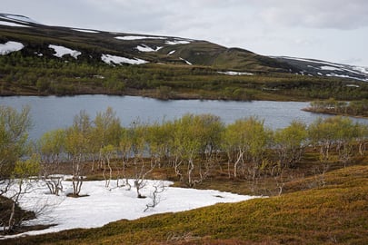 Hinter Austertana ändert sich die Landschaft erneut. Es geht hinauf ins Hochland, und das dichte Grün lichtet sich zusehends. Die Bäume werden kleiner, die Sträucher verschwinden, bis fast nichts mehr davon übrig ist. Stattdessen empfängt uns wieder eine winterliche Szenerie. Als wir auf der anderen Seite ins nächste Tal abfahren, scheint die Zeit plötzlich einen Sprung nach vorne zu machen: Hier geben sich Winter und Sommer die Hand – frisches Grün in den Bäumen, während am Boden noch Schneereste liegen. Ein für uns sehr ungewöhnliches Landschaftsbild.