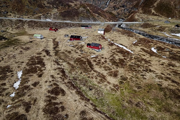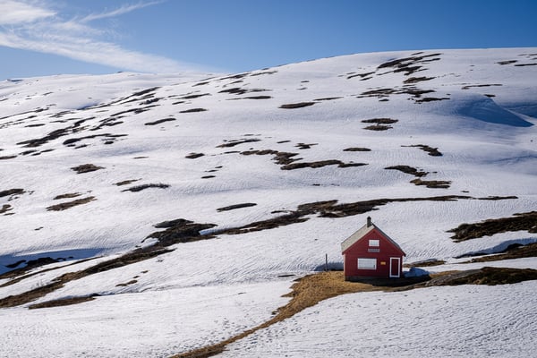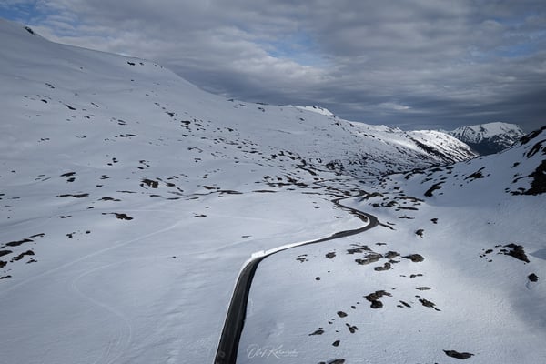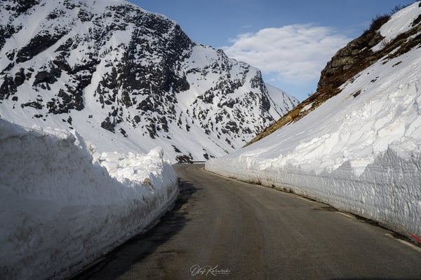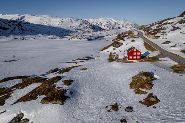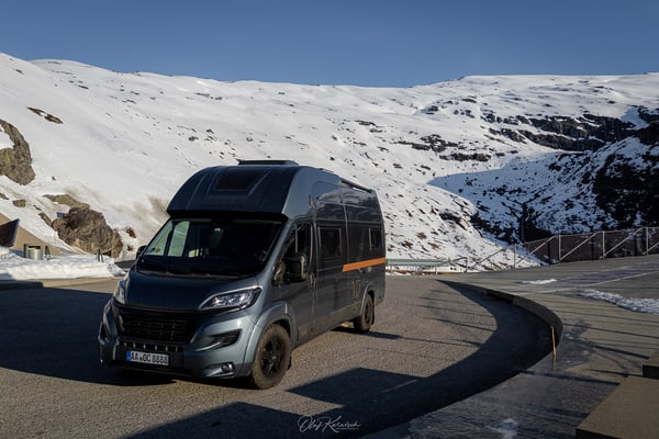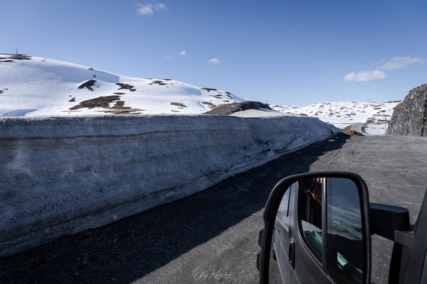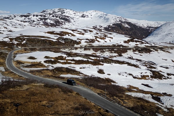 Auf dem Hochplateau erwartet uns eine beeindruckende Schneelandschaft. Besonders schön finden wir, dass bereits die ersten Felsen und Grasflächen aus den Schneefeldern hervorragen und die Umgebung dennoch völlig unberührt wirkt. Eine scheinbar endlose Weite, die nur von der Straße durchzogen wird. Auffällig sind auch die vereinzelten, farbenfroh gestrichenen Häuser, die als bunte Akzente in der weißen Landschaft stehen.