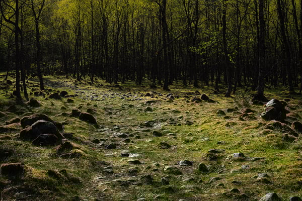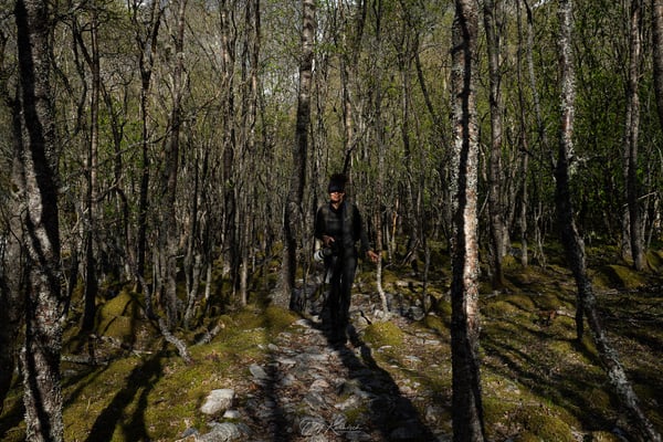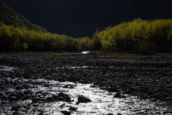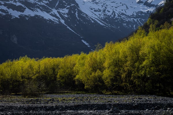 Der Weg führt ab hier unwegsamer über einen Steinpfad weiter durch den Birkenwald. Das frische Grün im späten Nachmittagslicht verleiht der Landschaft eine besondere Stimmung. Nach weiteren etwa 1,5 Kilometern erreichen wir einen Flusslauf, von dem aus der Gletscher wieder gut zu sehen ist. An dieser Stelle muss man sich entscheiden, ob man den sehr anspruchsvollen Weg bis näher an die Gletscherzunge fortsetzen möchte. Wir laufen auf den Steinen und Felsen weitere 1,5 km in den Berghang hinein. Dann endet die Tour für uns – der Weg verliert sich, das Gelände wird schwieriger, und das Risiko ist uns zu hoch.
