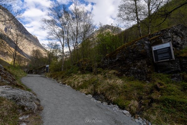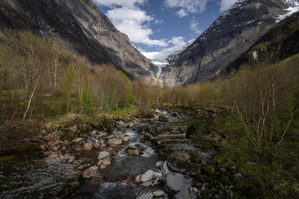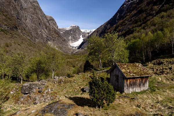 Gegen 15 Uhr fahren wir wieder ein Stück weiter ins Tal. Etwas näher am Gletscher gibt es einen kleinen, gebührenpflichtigen Parkplatz an einem Bauernhof. Von dort starten wir heute zur Wanderung zum Brenndalsbreen. Dieser Gletscher ist – wie der Briksdalsbreen – ein Ausläufer des großen Jostedalsbreen, aber deutlich weniger bekannt und touristisch kaum erschlossen.