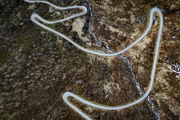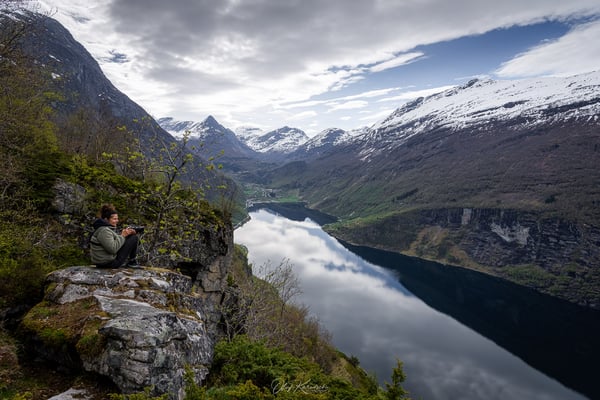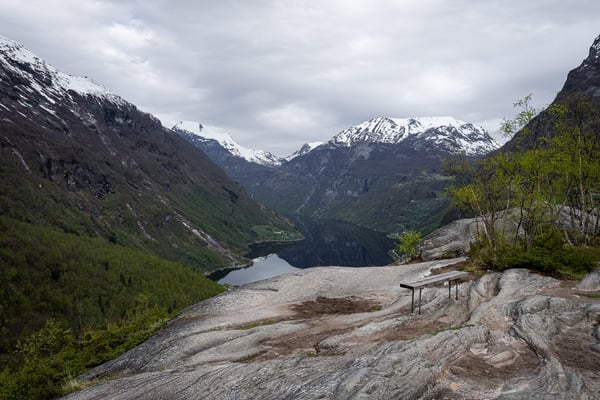 Nach einem längeren Stopp am Aussichtspunkt Flydalsjuvet fahren wir weiter hinab nach Geiranger – und direkt auf der anderen Seite des Fjords wieder über Serpentinen bergauf. Auf dieser Strecke lohnt sich ein Halt am Ørnesvingen Viewpoint. Von hier aus führt auch ein kleiner Pfad am Hang entlang, der nach etwa 100 bzw. 300 Metern schöne Blicke auf den Geirangerfjord ermöglicht.