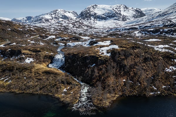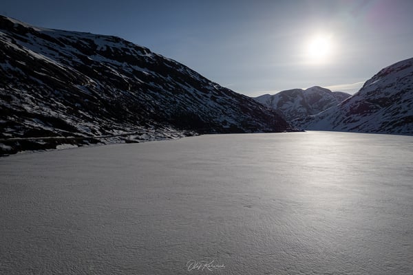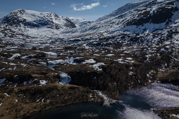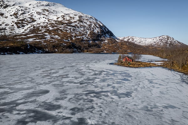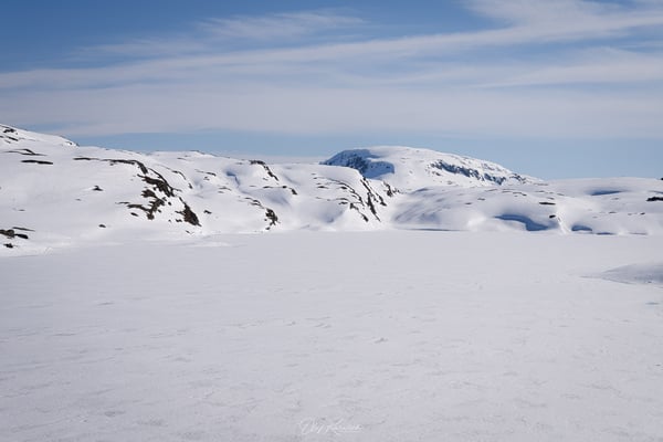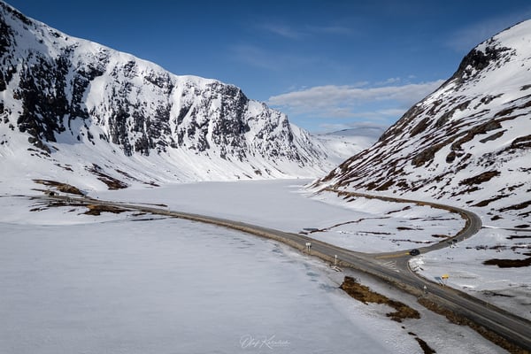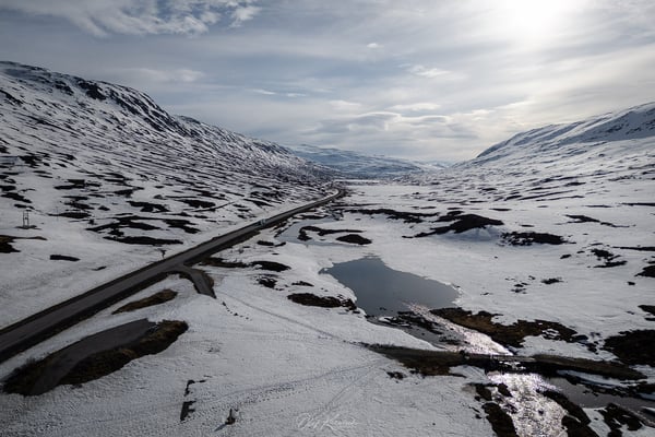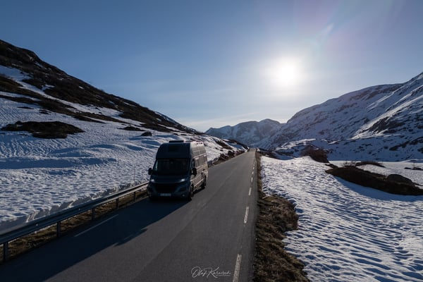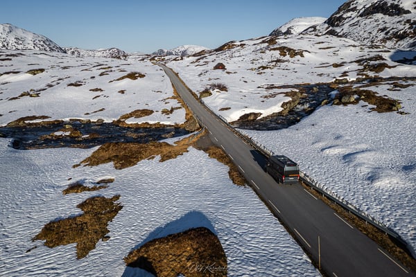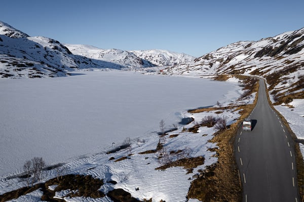 Wir fahren durch eine eindrucksvolle Schneelandschaft und genießen die weiten Ausblicke um uns herum. Die Route führt zunächst durch eine karge, schneebedeckte Hochgebirgslandschaft, vorbei am Langevatnet und über das Djupvatnet auf etwa 1.030 Metern Höhe – dem höchsten Punkt der Strecke.
