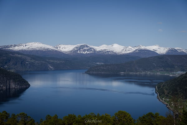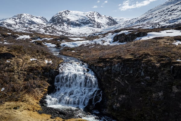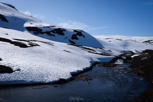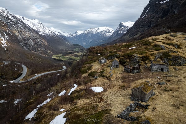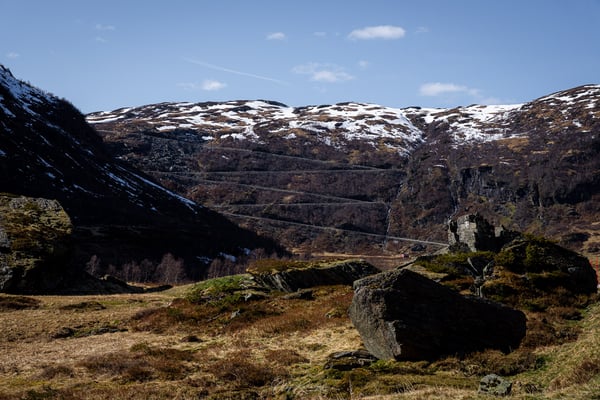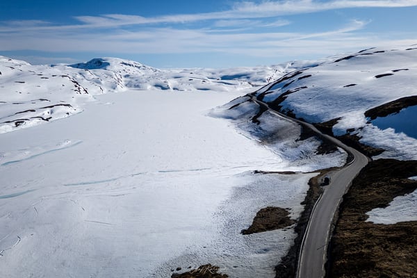 Der Weg dorthin führt uns aber zunächst über einige Serpentinen und grüne Berghänge hinauf ins Stølsheimen-Gebirge. Dieses Gebirge liegt zwischen dem Sognefjord und dem Hardangerfjord und ist bekannt für seine Hochplateaus, schroffen Berge und traditionellen Almgebiete („Stølen“ = Alm). Wir fahren durch eine schneebedeckte Landschaft und vorbei an zugefrorenen Seen. Ein erster Eindruck, wie winterlich die Landschaft hier auch Ende April noch sein kann. Wir genießen die Zeit auf dem Plateau, bevor es auf der anderen Seite – leider – gleich wieder hinab ins Tal geht.