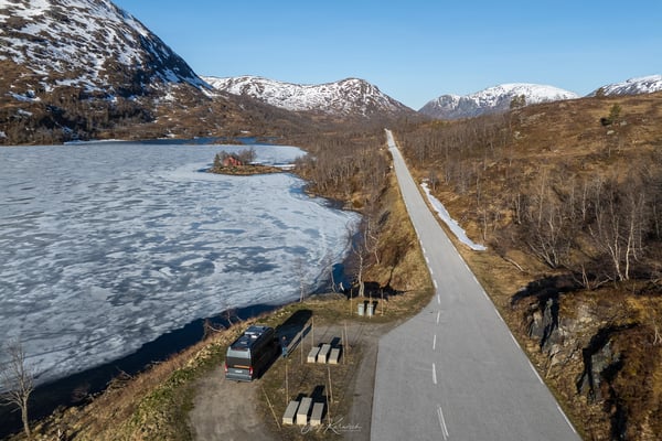 Nach einigen Kilometern entscheiden wir uns für eine Pause am Rasteplass Holmevatnet. Der fast noch zugefrorene See mit seiner kleinen Insel direkt vor dem Rastplatz ist ein perfekter Ort, um die Eindrücke auf sich wirken zu lassen. Hier nehmen wir uns Zeit für Frühstück und Arbeit – einen besseren Platz dafür kann man sich kaum vorstellen.