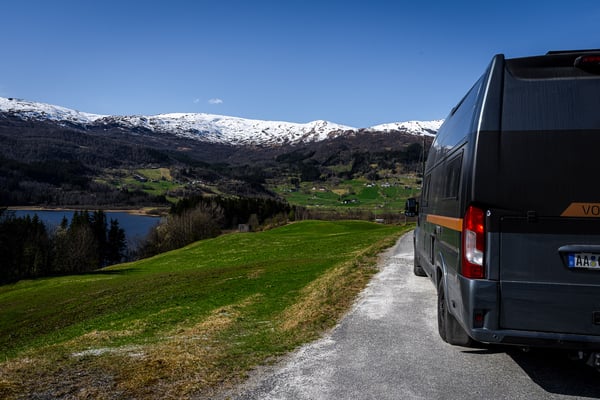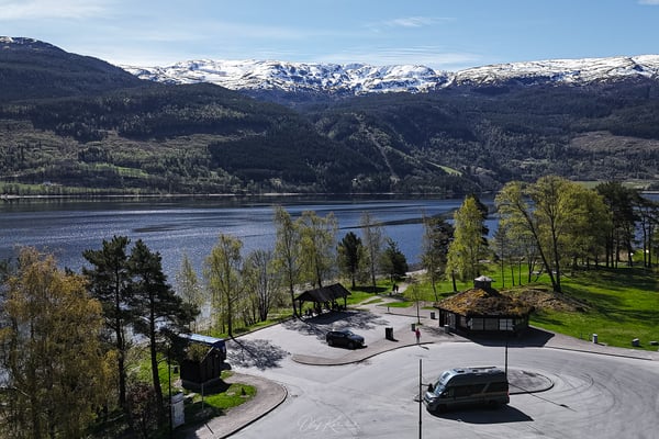 Wir nehmen uns noch etwas Zeit für die Arbeit, bevor wir Bergen über die 587 nach Norden verlassen. Zügig geht es auf die gut ausgebaute E16 bis nach Vossavangen. Diese breiten Straßen sind wir gar nicht gewohnt, und so kommen wir recht flott voran bis zu unserer ersten Rast kurz vor Vossavangen. Hier gönnen wir uns ein ausführliches Frühstück und genießen die wärmende Sonne auf einer Parkbank direkt am Vangsvatnet.