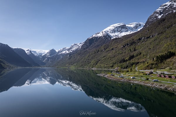 In Olden biegen wir rechts ab und folgen dem schmalen Gebirgstal bis zum Oldevatnet. Über eine enge Straße mit kleinen Tunneln erreichen wir schließlich den bisher schönsten Campingplatz unserer Norwegenreise. Auch wenn der Platz mit 370 NOK nicht günstig ist, genießen wir von unserem Stellplatz aus den direkten Blick auf den Gletscher. Wir stehen unmittelbar am spiegelglatten See – ein beeindruckendes Panorama.
