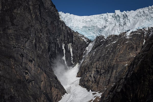 Beim Abstieg hören wir plötzlich das charakteristische Donnern eines Gletscherabbruchs – und können sogar mehrere kleine Abbrüche beobachten. Der Lärm hallt eindrucksvoll durchs Tal und klingt nur langsam zwischen den Felsen ab.