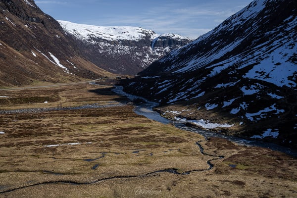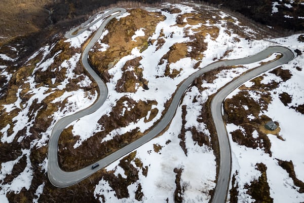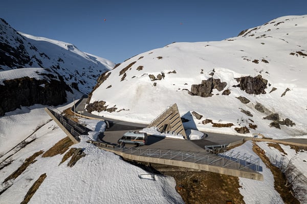 Die Straße wird nun deutlich schmaler, verfügt aber über zahlreiche Ausweichstellen entlang der engen Serpentinen, die uns rasch auf etwa 700 Höhenmeter und in eine wunderschöne Schneelandschaft hinaufführen. Unser erster Stopp ist am Gaularfjellet Utsikten – ein architektonisch markant gestalteter Aussichtspunkt mit fantastischem Blick über das Tal, die Wasserläufe und die Serpentinen, die wir gerade noch gefahren sind.