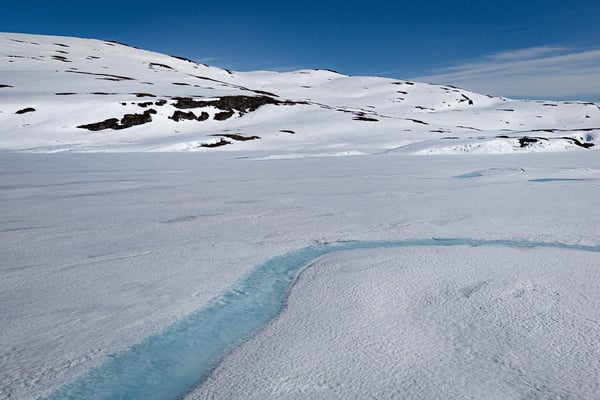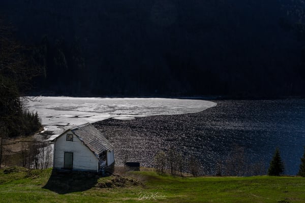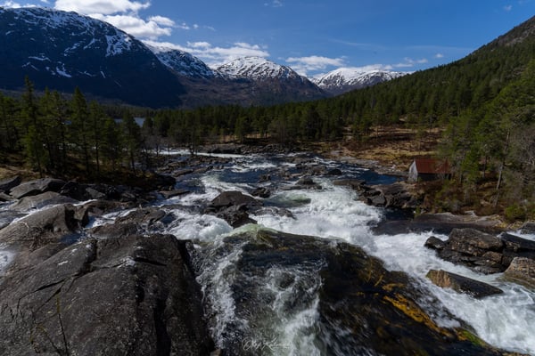 Bei Vinje erreichen wir den Myrkdalsvatnet, einen See, der noch teilweise zugefroren ist. Das aktuell schöne Wetter arbeitet jedoch kräftig daran, die Eisschollen aufzubrechen – ein beeindruckender Anblick und nur ein Vorgeschmack auf das, was uns auf den folgenden Kilometern erwarten würde.