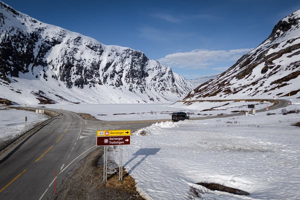 Die Landschaftsroute erreichen wir über die Rv15. Der Anstieg führt uns auf rund 900 Höhenmeter, die wir durch einige lange Tunnel erreichen. An der Abzweigung zur Rv63 biegen wir links ab – und freuen uns, dass die staatliche Seite recht behalten hat: Die Straße nach Geiranger ist geöffnet.