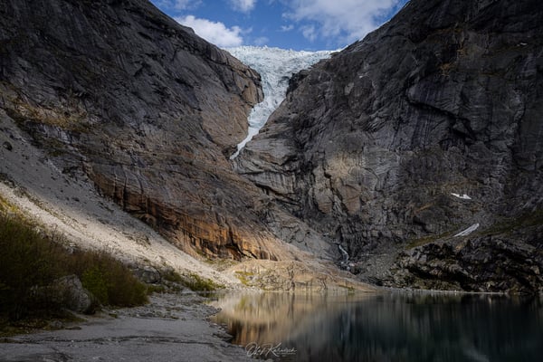 Der Weg zum Gletschersee ist rund 3 Kilometer lang, dabei überwinden wir etwa 250 bis 300 Höhenmeter. Der Weg ist gut ausgebaut und führt entlang des tosenden Schmelzwassers. Da der Briksdalsbreen in der Hochsaison stark besucht sein kann, gibt es sogar kleine Shuttlefahrzeuge („Troll Cars“), die bis nahe an den Gletschersee fahren. An diesem Tag bleiben wir jedoch vom Trubel verschont. Nur zwei junge Frauen begegnen uns unterwegs – ansonsten genießen wir die Wanderung und die Ruhe am Gletschersee ganz für uns allein. Die einzige Geräuschkulisse ist das Rauschen des Schmelzwassers.