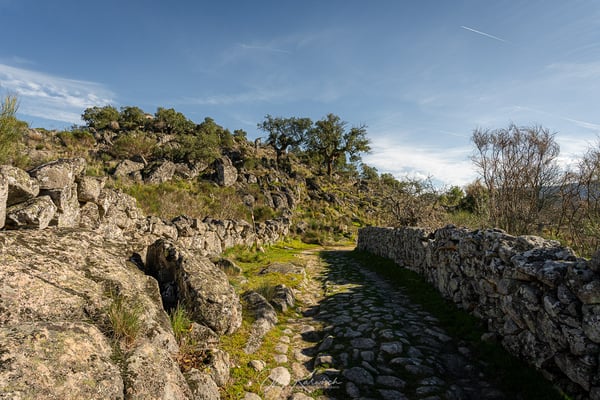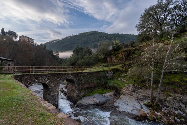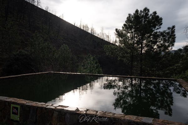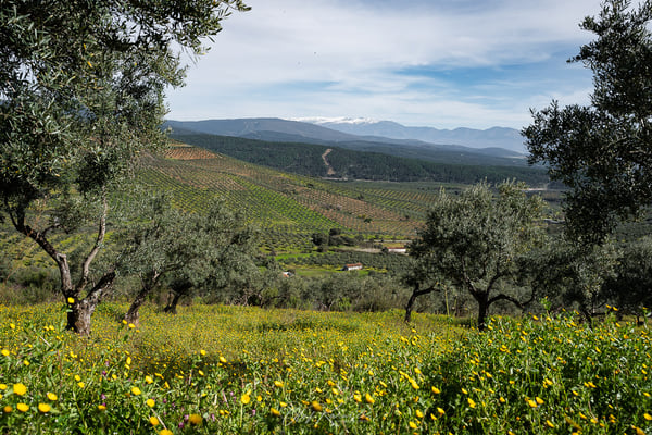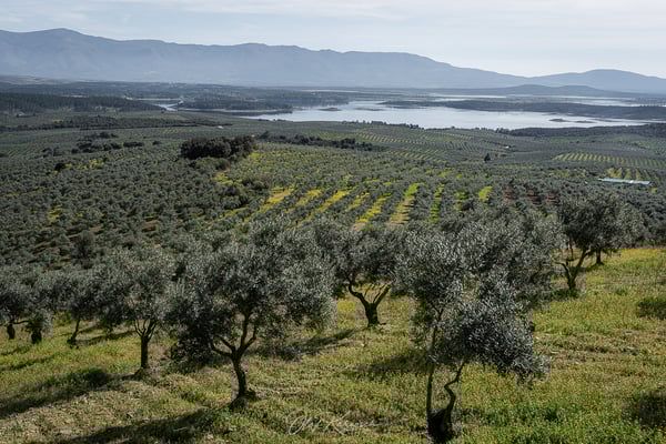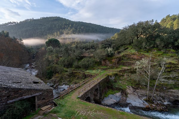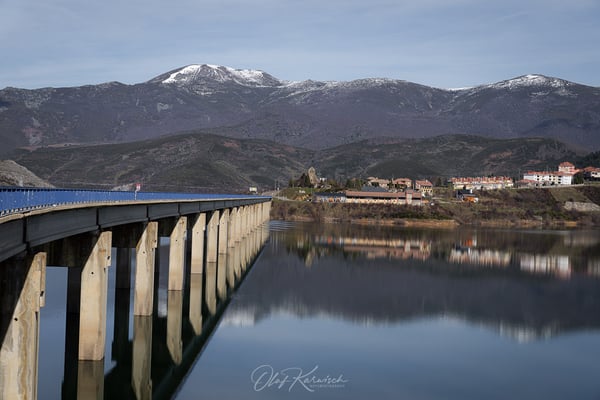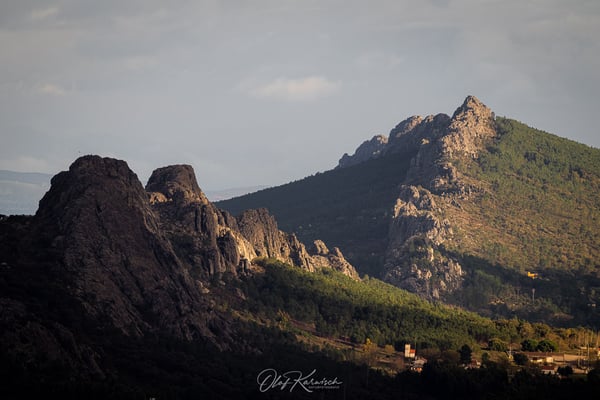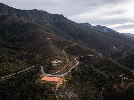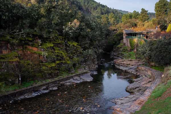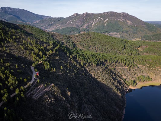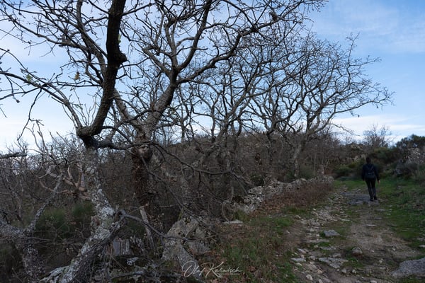 Entlang des Embalse de Gabriel y Galán fahren wir auf der gut ausgebauten CC-12.2, der EX-205 und später über die EX-204 bis nach Riomalo de Abajo. Entlang der Strecke gibt es wunderschöne Aussichten auf das Tal rund um den Stausee: weiche Hügel mit Olivenhainen, soweit das Auge reicht, das Wasser des Stausees im Tal und die schneebedeckten Berge der Sierra de Béjar im Hintergrund – was für eine traumhafte Landschaft! Wir sind in Las Hurdes angekommen, einer wildromantischen Region mit dichten Wäldern und Hügeln.