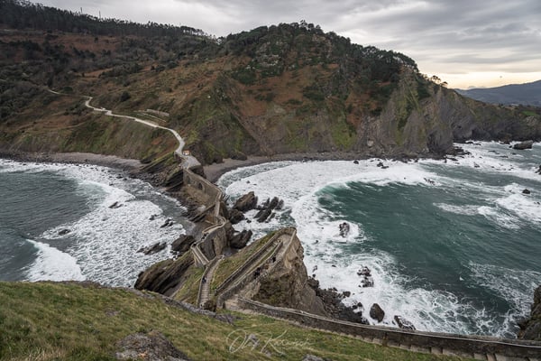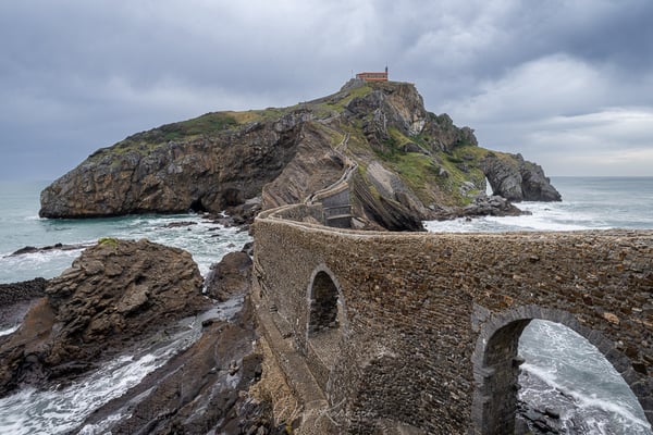 Diese beeindruckende Felseninsel ist eine der bekanntesten Touristenattraktionen Spaniens. Eine atemberaubende Filmkulisse erwartet uns – in der 7. Staffel von Game of Thrones wurde dieser Ort als Drachenstein, der Sitz des Hauses Targaryen, genutzt. Das zieht viele Besucher an, und so ist es nicht verwunderlich, dass sich die Menschengruppen zuerst auf den steilen Abstieg von über 100 Höhenmetern machen, um dann über eine Steinbrücke auf die vorgelagerte Halbinsel zu gelangen und dort 241 Treppenstufen hinaufzusteigen.
