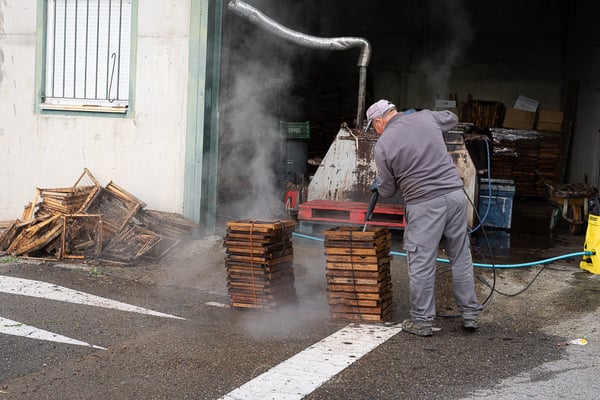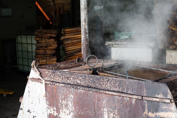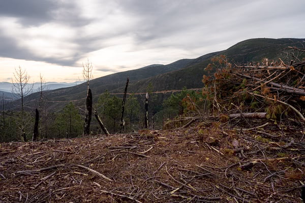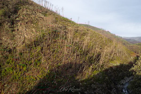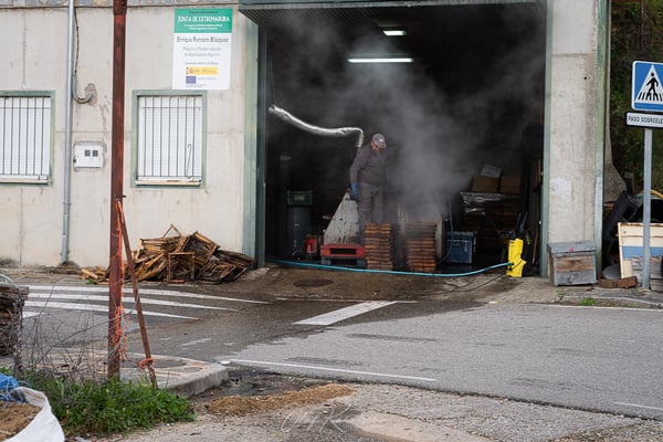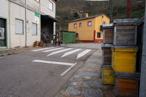 Am Samstagmorgen ging es bei Sonnenaufgang weiter in den Norden. Der erste Teil der Strecke war dabei besonders beeindruckend. Am nördlichen Rand der Extremadura entlang fahren wir auf der CC-158 eine wunderschöne Strecke in die Berge. Schon nach wenigen Kilometern machen wir den ersten Fotostopp – und so geht es immer weiter. In einem Dorf beobachten wir einen Mann, der die Rahmen der Imker sortiert und in mehreren Stufen auskocht. Das konnten wir mit ein paar Bildern dokumentieren. Weiter geht es dann über die EX-366 bis hinauf zum Mirador De Las Carrascas, einem 360°-Aussichtspunkt auf etwa 1150 m. Die Berghänge sind erschreckend kahl, da in dieser Gegend im Mai 2023 rund 8.500 Hektar Wald durch ein Feuer zerstört wurden.