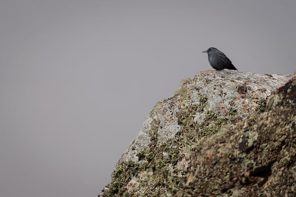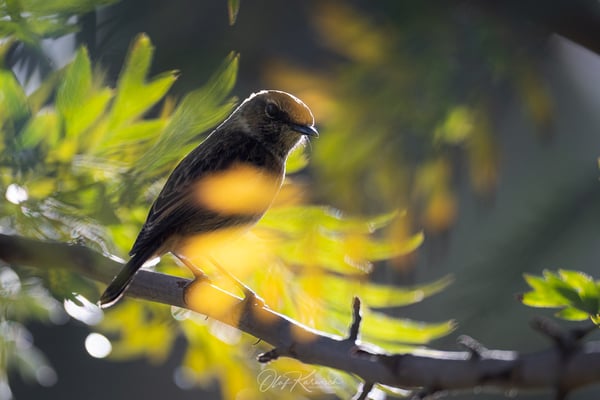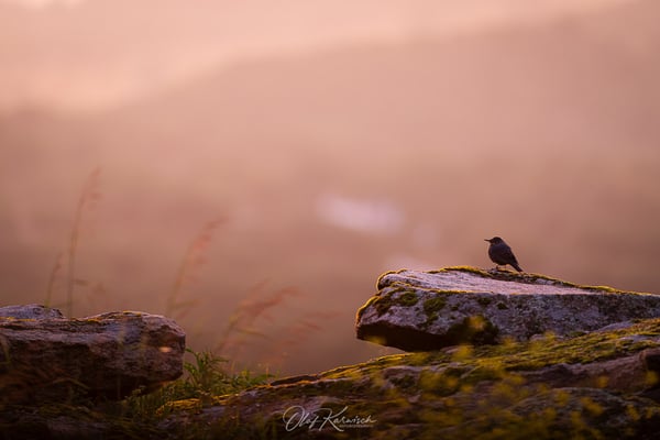 Die nächsten zwei Tage verlaufen völlig anders, als wir es bisher gewohnt waren. Das “Hide” glich eher einer Veranda, vor der mit Strohmatten eine Sichtschutzwand errichtet wurde. Die Sichtfenster wurden einfach aus den Strohmatten herausgeschnitten. Es gab kein Glas, durch das man fotografieren konnte – stattdessen sollten wir etwa einen Meter Abstand von den Sichtfenstern halten, damit unsere Bewegungen die Luchse nicht störten. Wir saßen in bequemen Bürostühlen und warteten gespannt auf das, was kommen würde. Den Anfang machte ein fantastischer Sonnenaufgang, verbunden mit leichtem Dunst, der ein wunderschönes Licht zauberte. Jetzt der Luchs, denkt man sich unwillkürlich – doch er bleibt aus. Stattdessen beobachten wir eine junge Blaumerle, die auf Beutejagd geht.