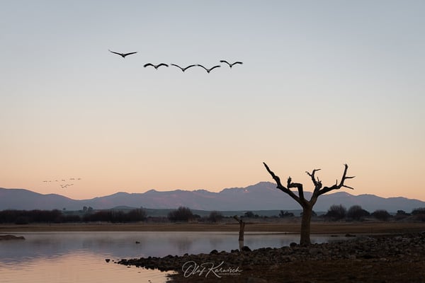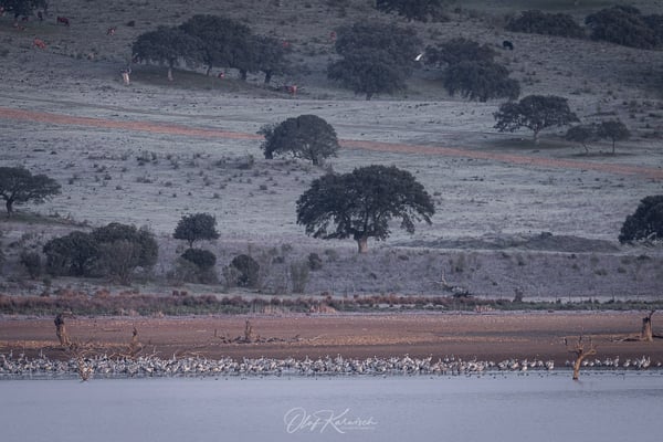Kurz darauf verlassen wir die Extremadura und wechseln nach Kastilien und León. Die Straße führt uns bergab auf eine Hochebene. Nach langer Zeit sehen wir wieder die berühmten Ibérico-Schweine unter den Steineichen – ein fast schon idyllisches Bild. Leider jedoch auch mit dem Hintergedanken, warum sie hier die Eicheln fressen dürfen. Bevor wir die Dehesa verlassen und in eine von Ackerbau geprägte Landschaft weiterfahren, entdecken wir noch ein paar letzte Kraniche, die sich auf den Feldern für die Abreise in den Norden vorbereiten. Zwei Stunden vor Sonnenuntergang kommen wir in Villafáfila an und machen noch eine Rundtour entlang der Lagunen.