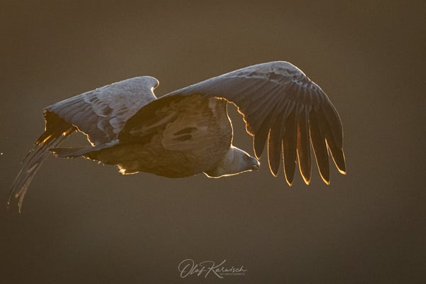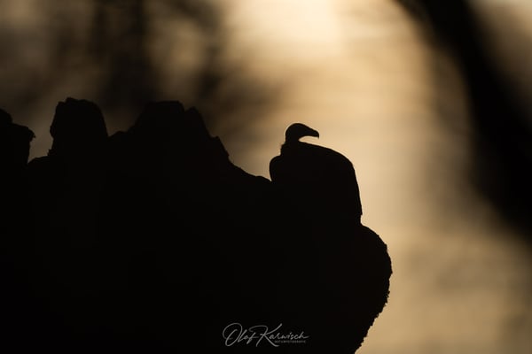 Schon vor Sonnenaufgang tauchte ein Weibchen auf, das wir bisher noch nicht gesehen hatten. Es setzte sich vor einen Baumstamm und musterte aufmerksam den Platz vor dem Hide. Gestern hatte es hier wohl einen Hasen gerissen – ja, genau, direkt vor den Augen der Fotografen. Heute war jedoch kein Jagderfolg in Sicht. Dennoch konnten wir in den etwa 20 Minuten wunderschöne Porträts aufnehmen. Kurz bevor die Sonne aufging, verschwand das Weibchen.