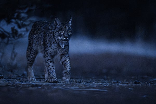 Gegen 11 Uhr beenden wir die erste Session – leider ohne einen Luchs vor der Kamera. Da in der Mittagszeit nach unserer Erfahrung ohnehin wenig los ist, nutzen wir die Zeit außerhalb des Hides für Arbeit, ein Mittagessen und einen Spaziergang. Um 15 Uhr geht es weiter, und kurz nach Sonnenuntergang ist es dann endlich so weit: Ein Männchen aus dem Revier bewegt sich fast unbemerkt von links in unseren Sichtbereich. Erst sitzt es nur da, dann läuft es langsam weiter nach rechts. Es ist noch etwas Resthelligkeit vorhanden, und in Kombination mit dem warmen Licht der Scheinwerfer entstehen faszinierende Bilder.