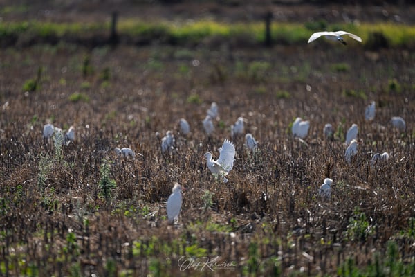 - Kuhreiher – oft in größeren Trupps auf Feldern nach Nahrung suchend.
